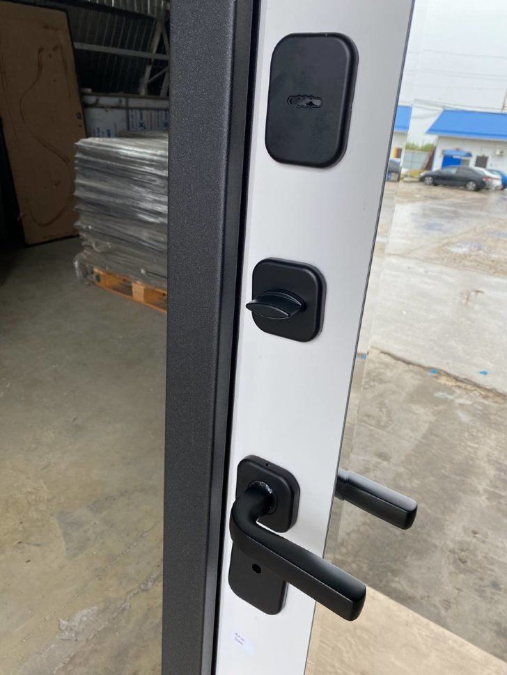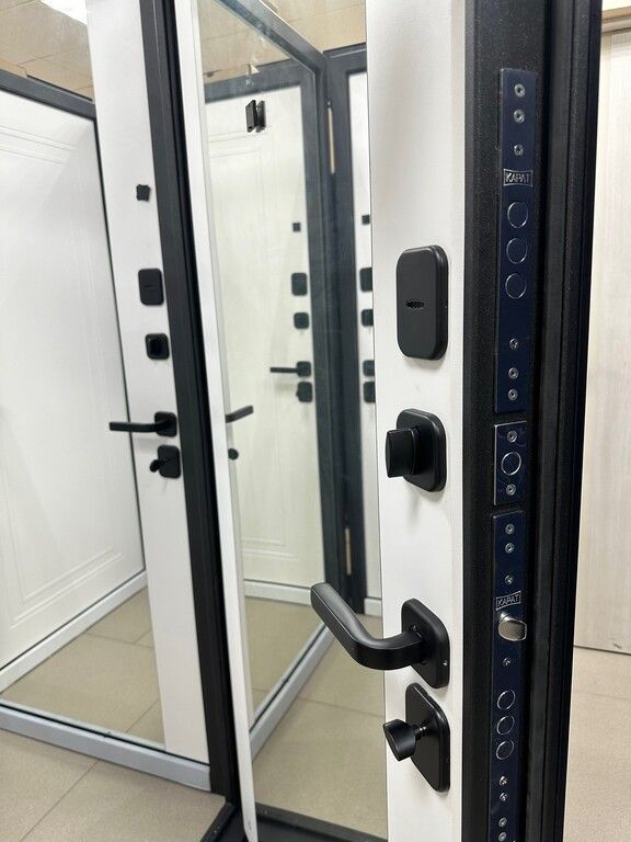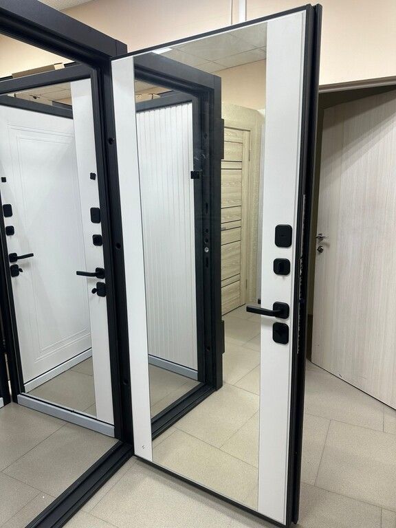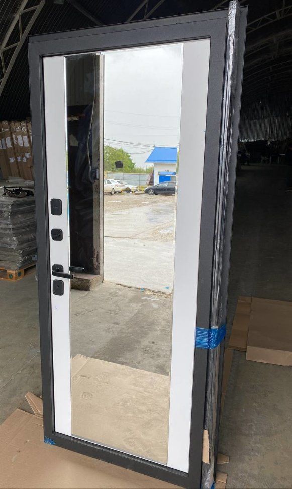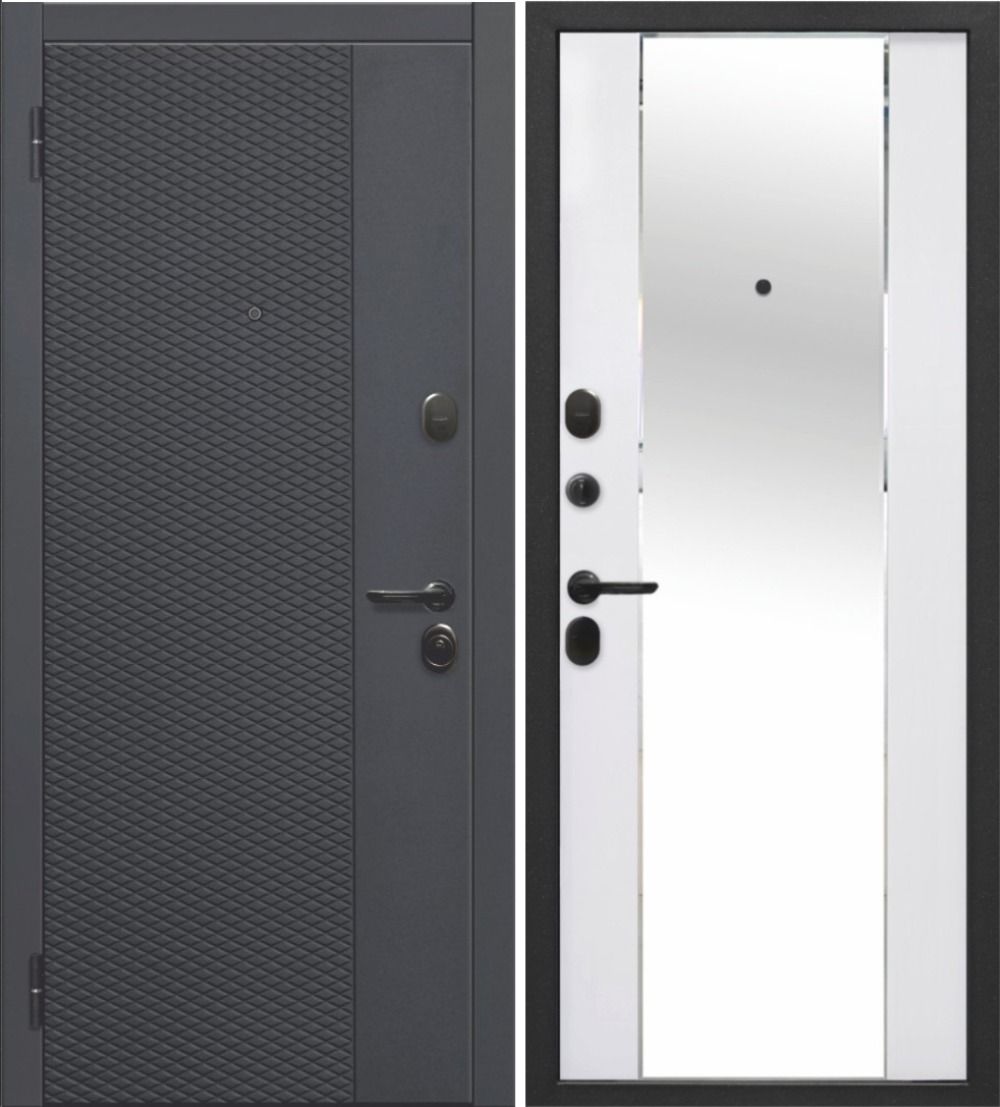 Входная дверь 7,5 см Флорида черный кварц - фрезерованная МДФ панель, цвет - эмалит белый, накладное зеркало с фацетом с защитной плёнкой — купить в Казани по цене 27 900 руб. — RosDoor (Сталь-сервис)